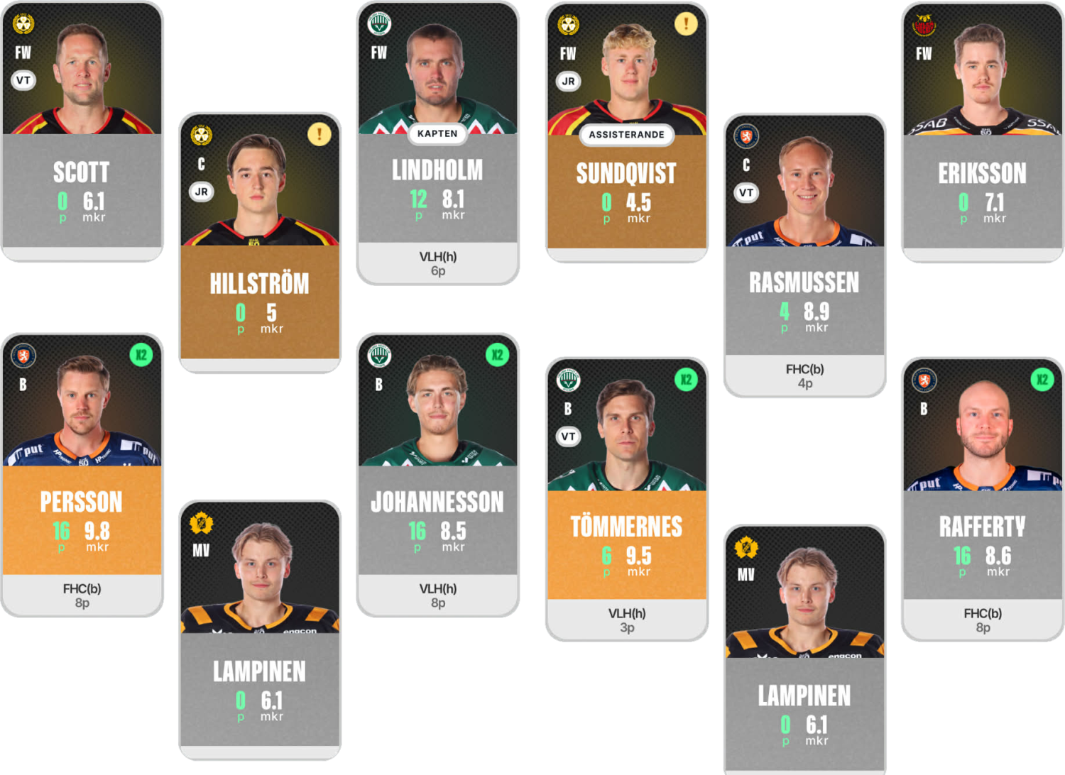 – Tömmernes, Rafferty och Persson var ganska solklara val. Men jag gjorde en sista-minuten-ändring och tog in Samuel Johannesson. Jag vet vad han kan göra sedan tiden i Brynäs och tänkte att han skulle vara extra taggad inför sin första hemmamatch för Frölunda, säger Alexander.